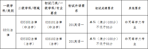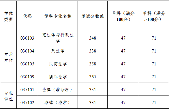 (二)法律专业硕士学位点招收“退役大学生士兵”专项计划考生,复试分数要求:复试分数要求:①法律专业硕士初试成绩总分≥260分。②考试科目满分为100分的,单科成绩不低于30分;考试科目满分>100分的,单科成绩不低于65分。