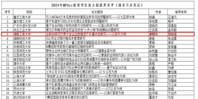 程晓娟老师指导的由研究生唐朝伟撰写的《互联网知识付费平台企业数据资产价值评估研究 —— 以知乎为例》学位论文,成功荣获 2024 年全国 MPAcc 优秀学位论文奖。