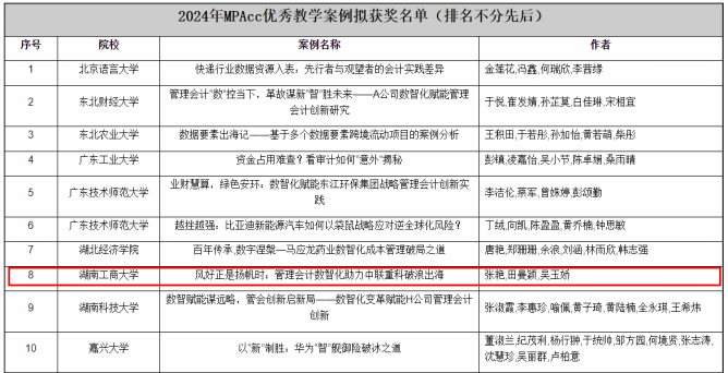 张艳老师指导的教学案例《风好正是扬帆时:管理会计数智化助力中联重科破浪出海》荣获2024年全国MPAcc优秀教学案例奖。同时,5篇案例入选2024年全国MPAcc教学案例库,分别是张艳老师指导的教学案例《“风好正是扬帆时:管理会计数智化助力中联重科破浪出海》,王青松老师指导的教学案例《技术生态领革新,数智管理筑未来——中联重科管理会计创新赋能企业核心竞争力的路径研究》,侯旭华老师指导的教学案例《互联网保险公司如何挥舞好“科技+管理”双翼?——探索新业态下的保险科技创新绩效评价方法》,李灿老师指导的教学案例《“精美的石头会唱歌”——施茶村自然资源资本化与生态产品价值实现研究》,曾爱青老师指导的教学案例《智能管理会计赋能企业核心竞争力——以TW公司为例》。